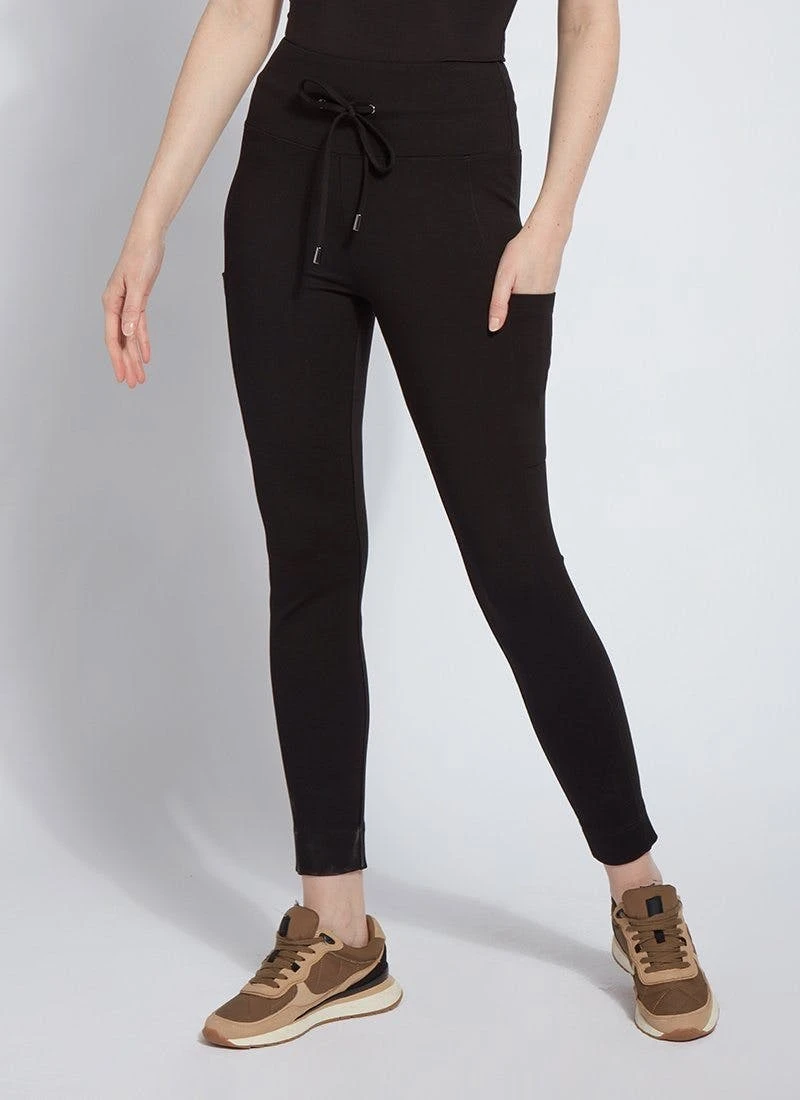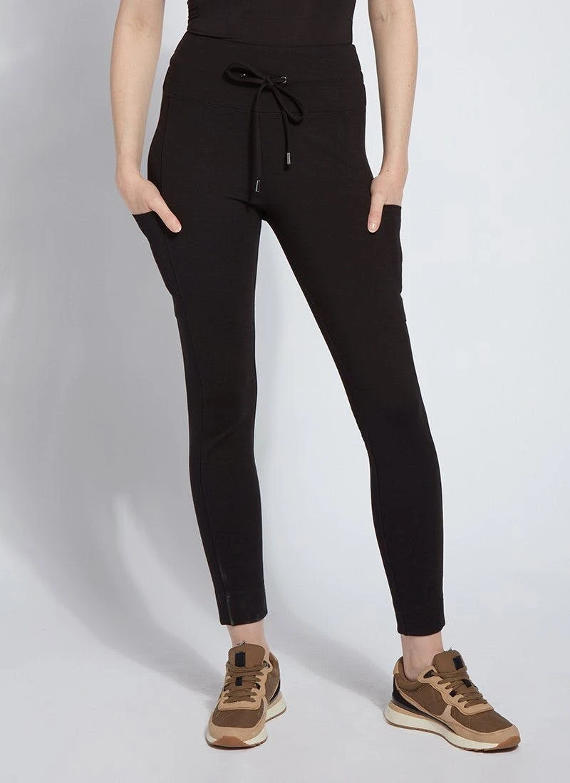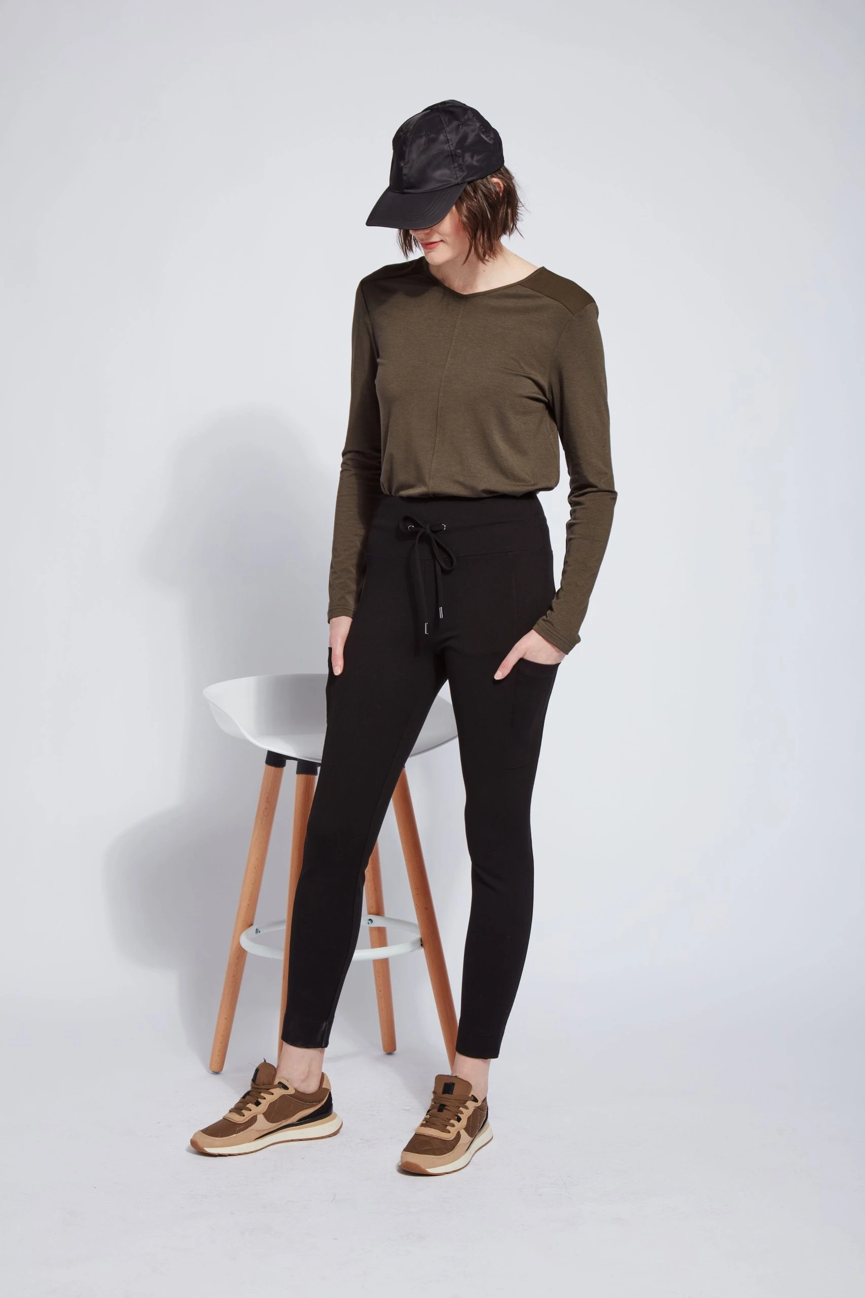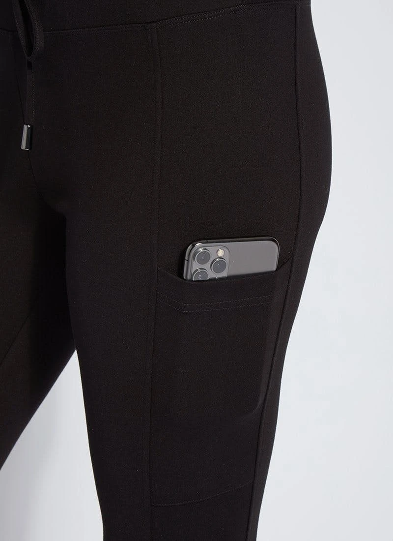 A hybrid between a legging and a jogger, The Premium Lounge Jogger offers a slimming, body-hugging fit with functional side phone pockets and front drawstring with shiny, gunmetal stoppers. Constructed using 4x-stretch Ponte, these jogger-leggings feature a signature concealed waistband, waist seam and wide hem facing. Wear them with a cropped sweatshirt and sneakers or tucked camo top and booties.