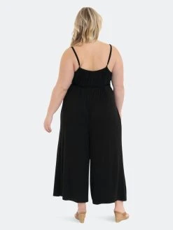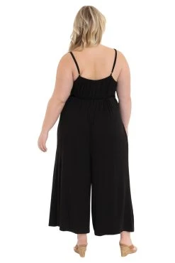 The curve teri jersey jumpsuit with spaghetti straps, handy pockets, and a removable belt is available in two colors basic black and electric blue. Dress it up with heels or keep it casual as shown, this look works from errands to dinner alfresco.