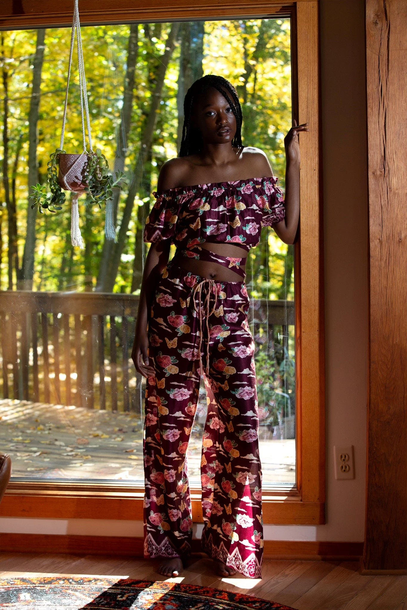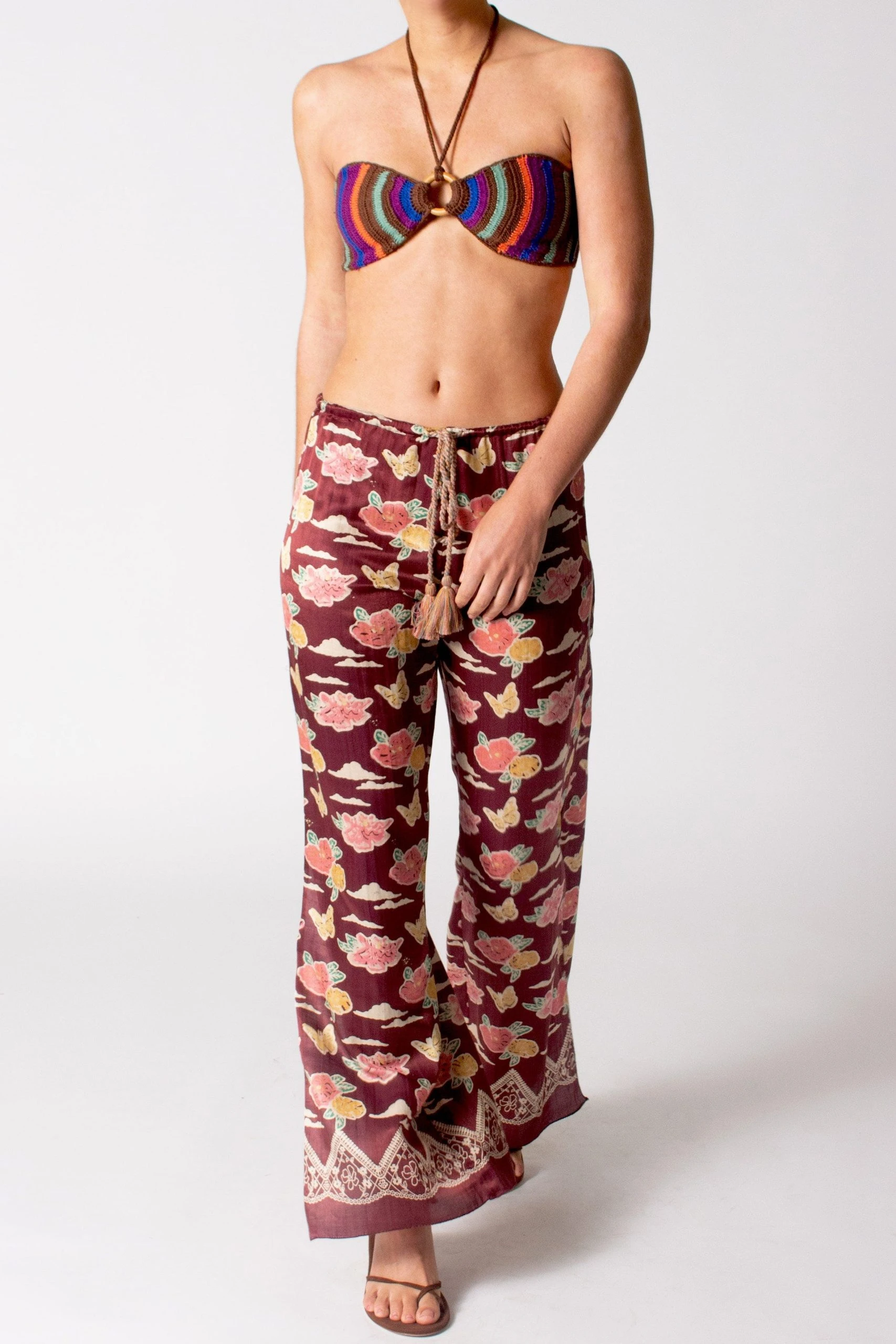 – Drawstring waistband- Side leg slits- Custom designed block print