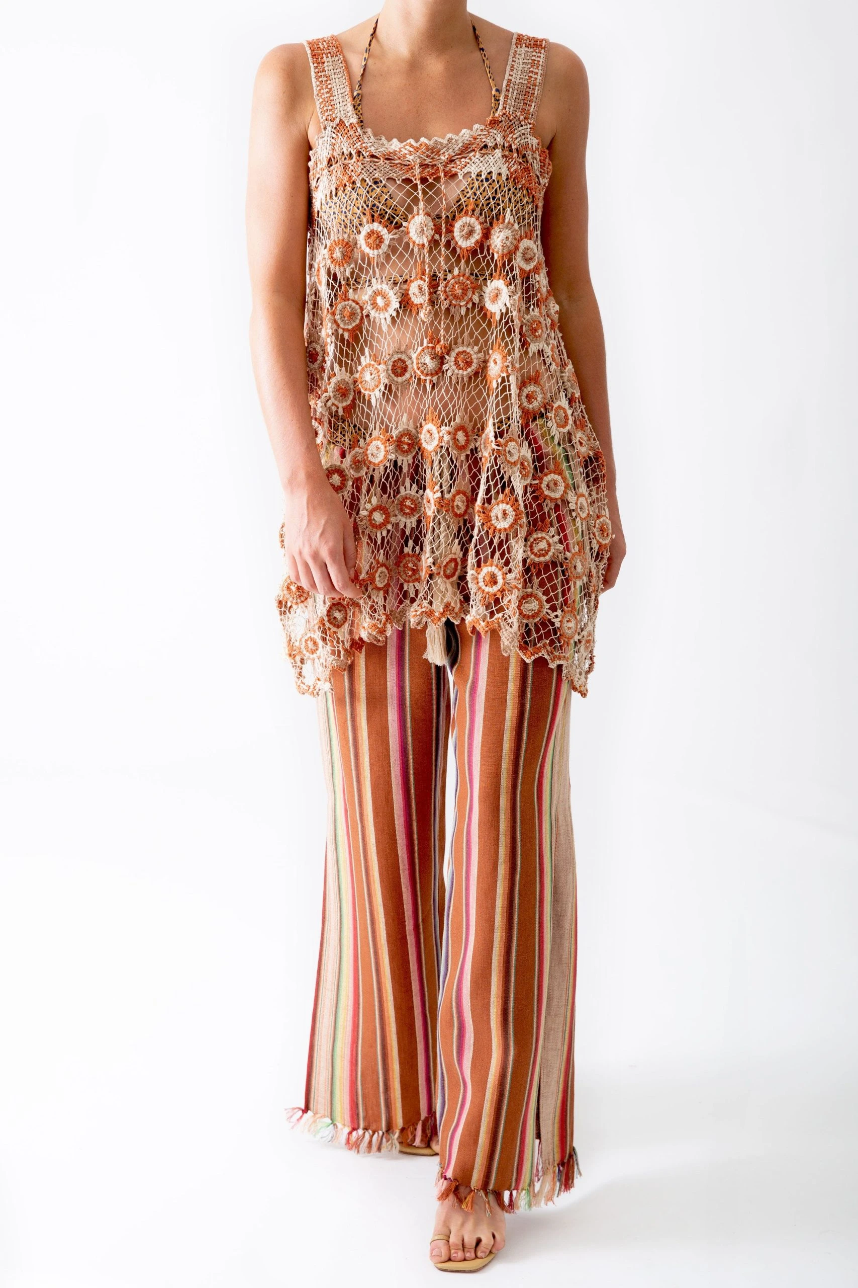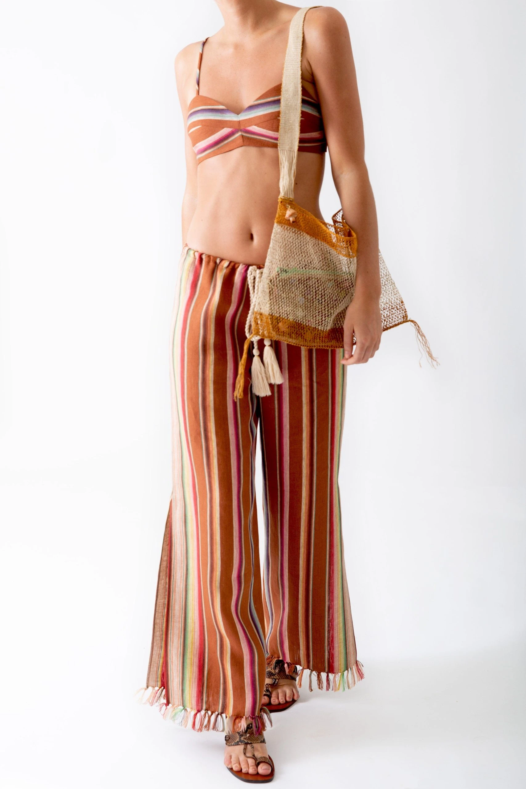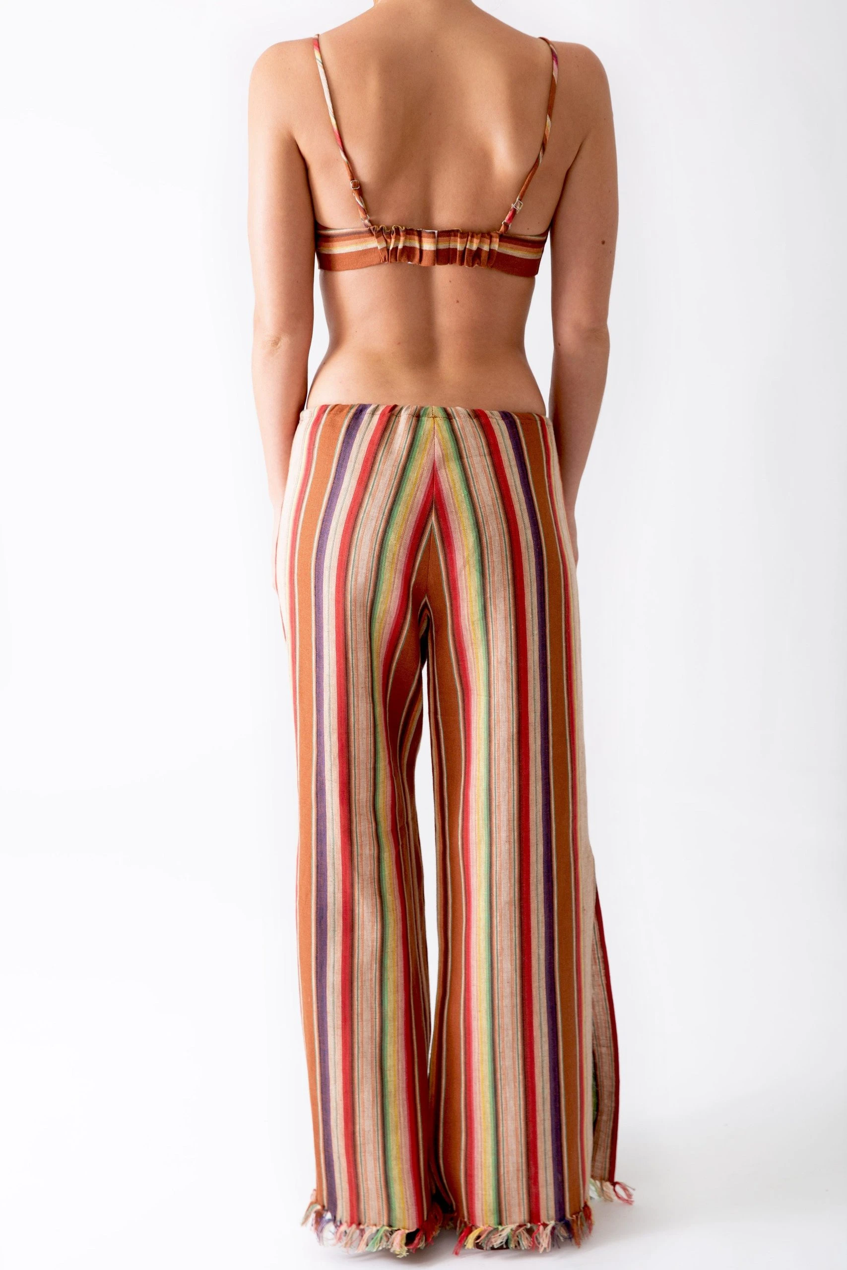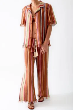 Our new bohemian-chic rust stripes collection conjures goa in the 70s, when all you needed was the beach and your guitar. This fifi pant is the same breezy silhouette you love, just in our groovy striped linen and with an updated fit for a more relaxed vibe. Hand-fringed tassels at your ankles, a tassel rope belt, and knee-high side slits make this our coolest fifi ever.