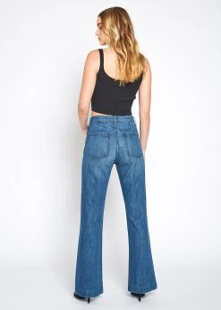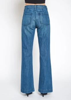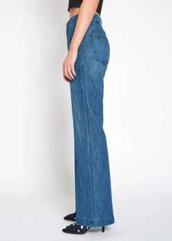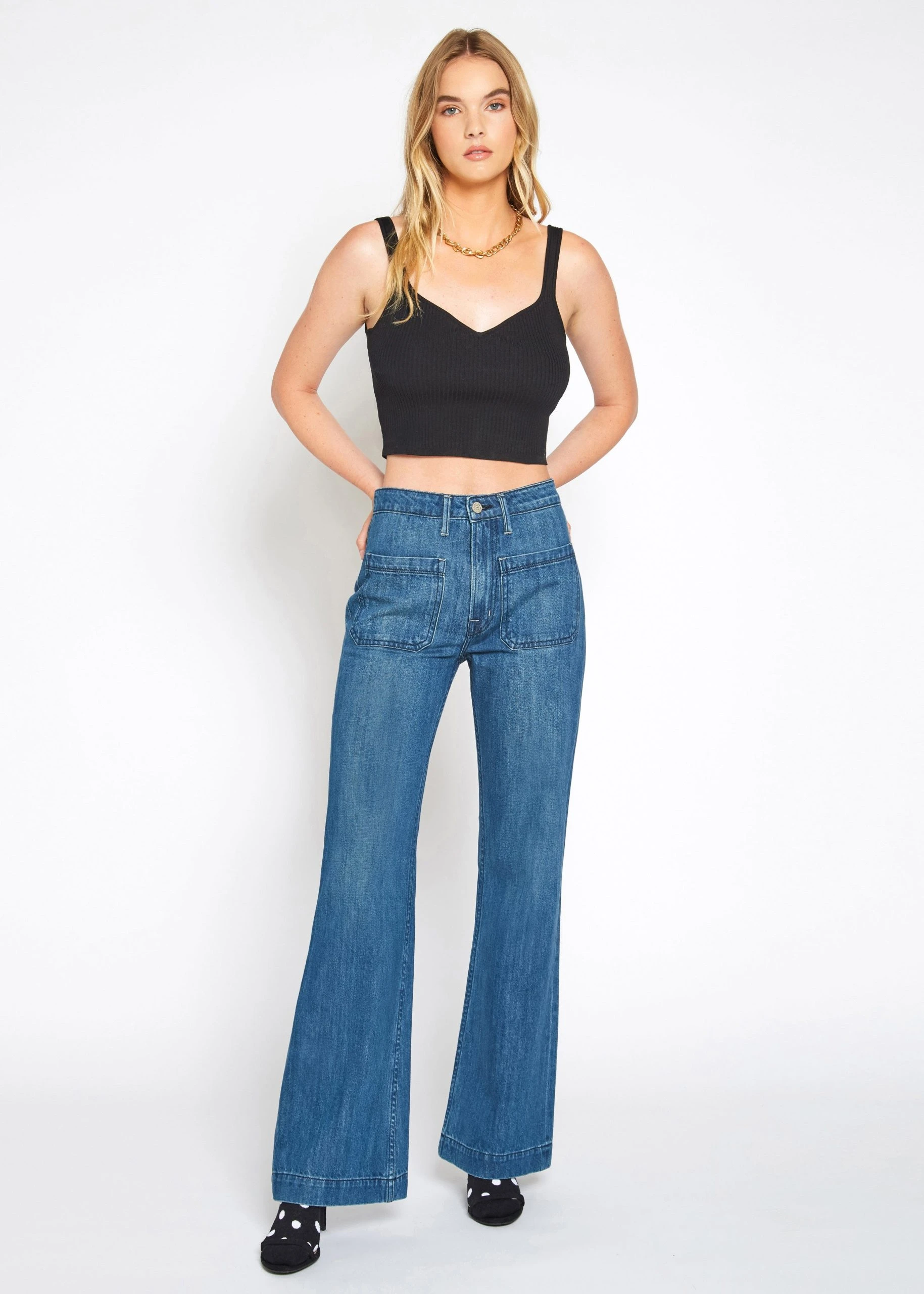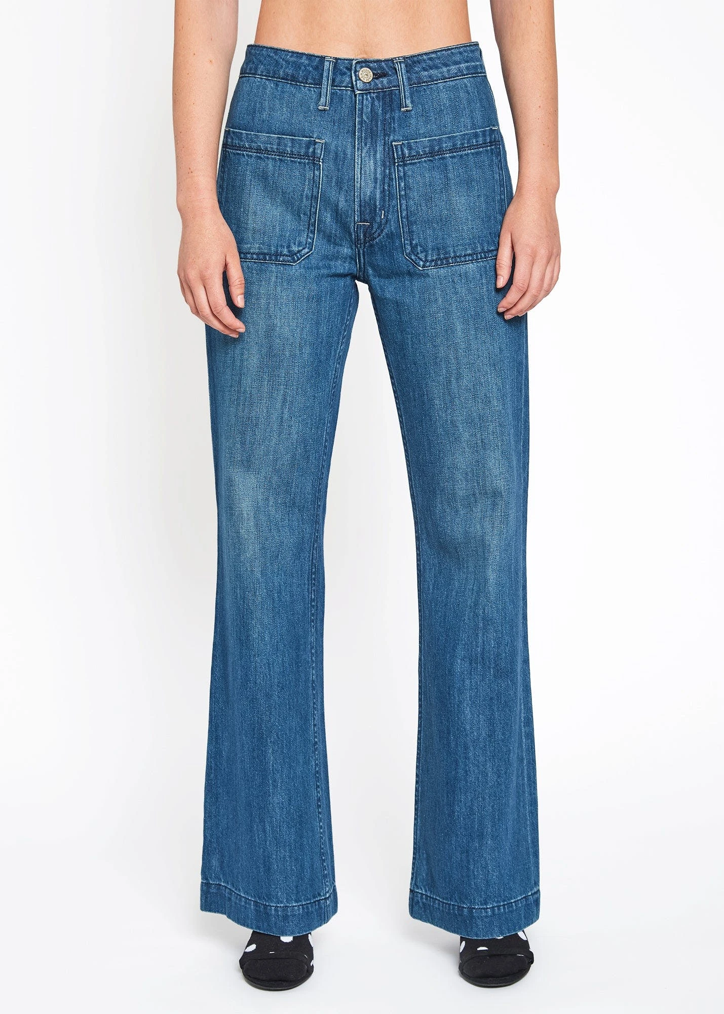 – High rise wide flare with patch pockets- Vista wash- Size range: 24~31- Rise: 11″- Inseam: 33 1/2″- Knee: 18″- Leg opening: 22″