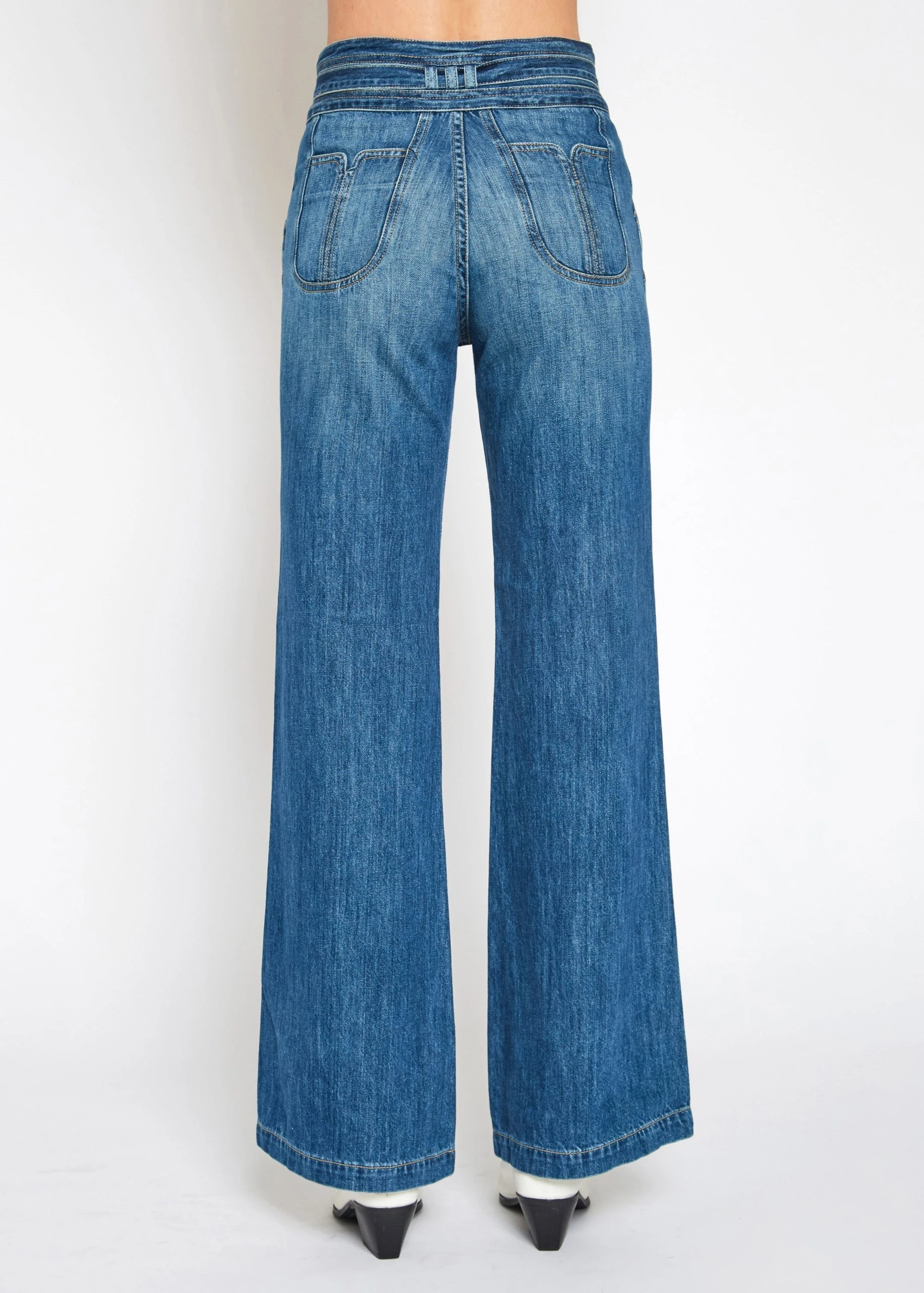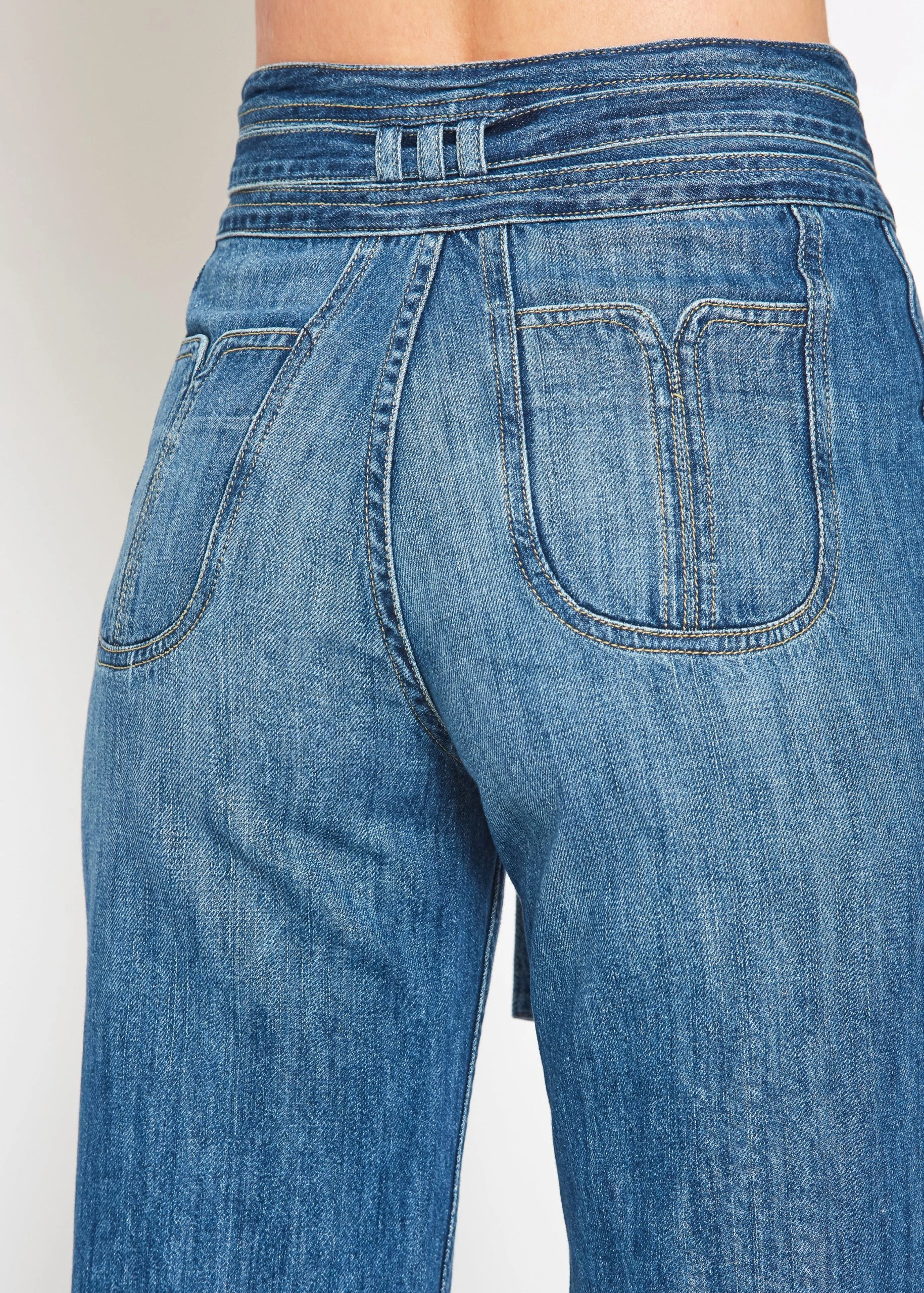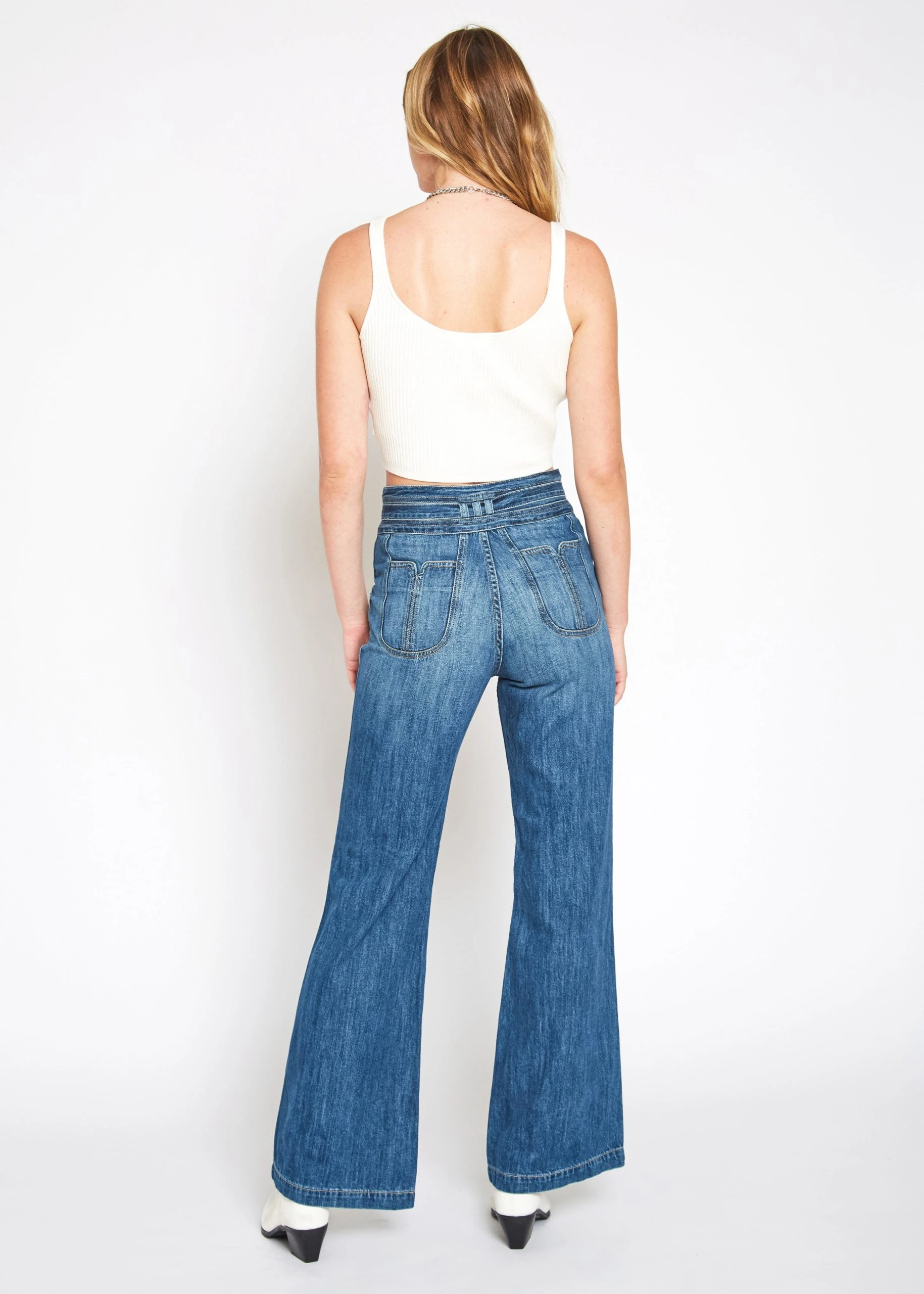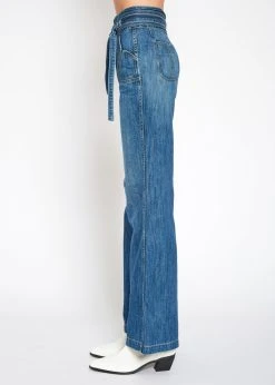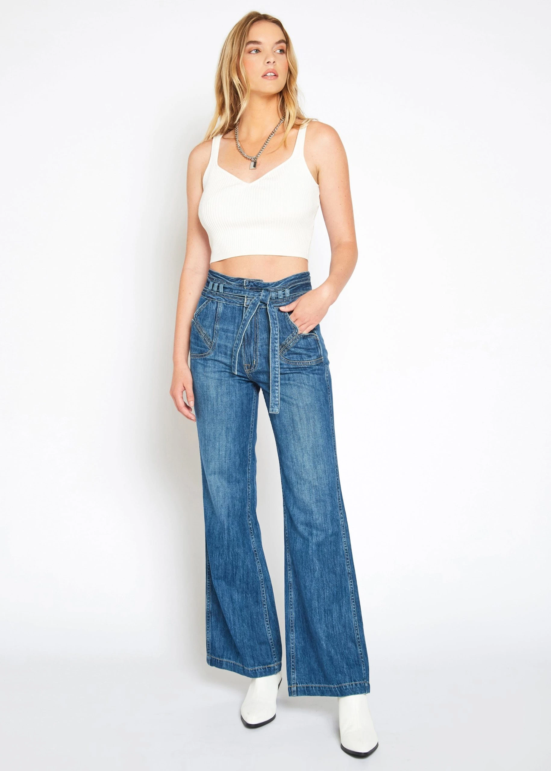 Belted high rise wide leg with fashion pocket and waistband wash.