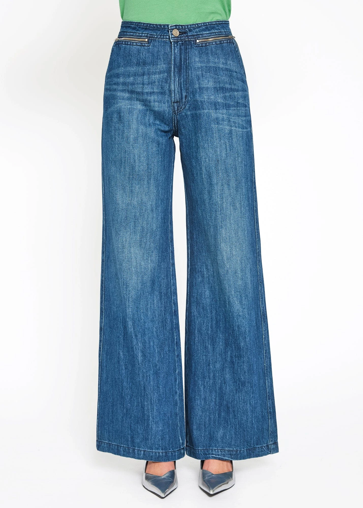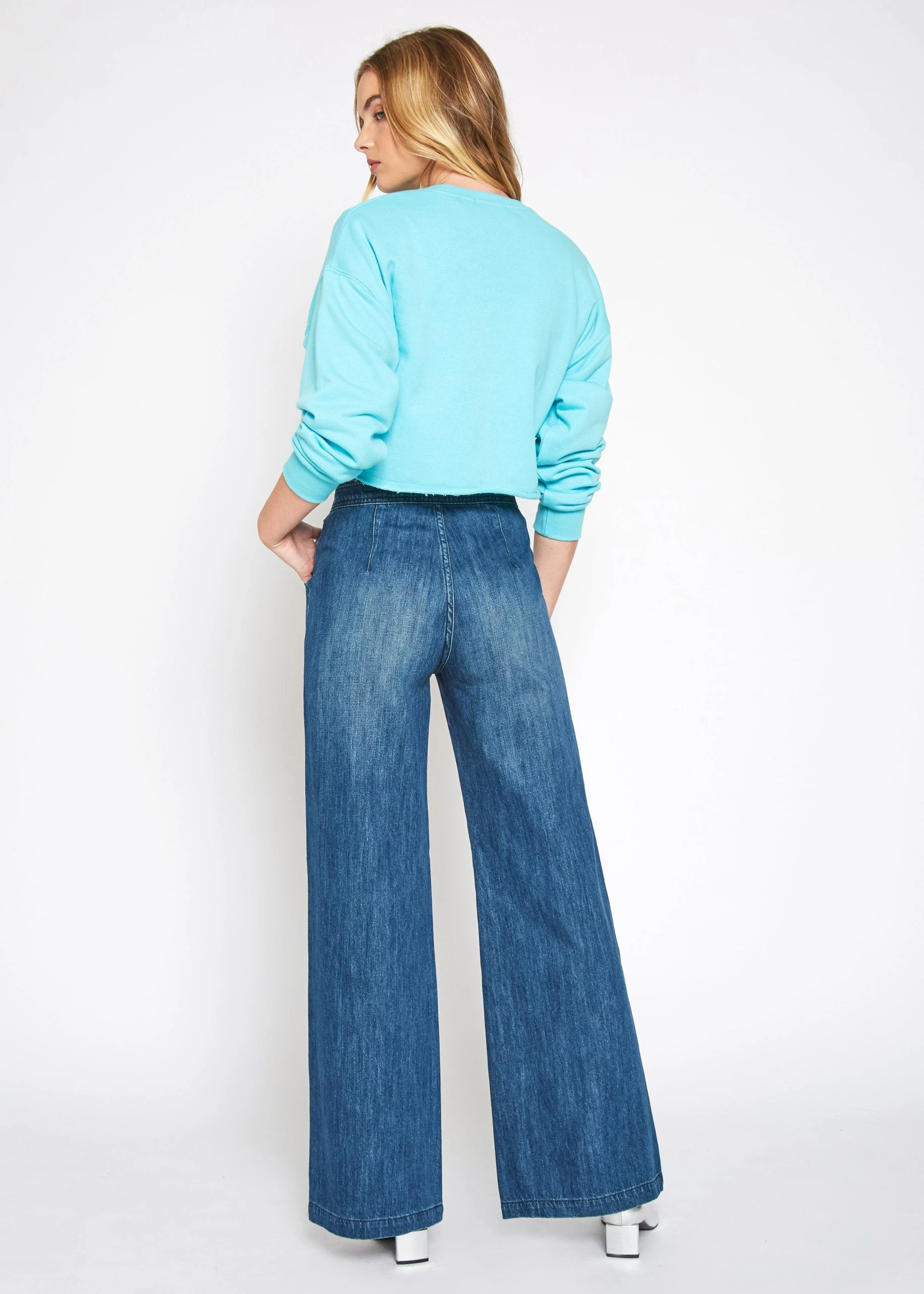 – High rise wide leg with zipper- Bend wash- Size range: 24~31- Rise: 12″- Inseam: 33 1/2″- Knee: 22″- Leg opening: 25″