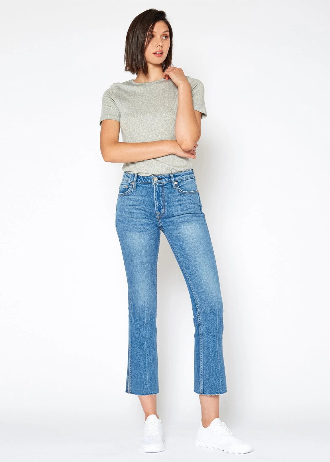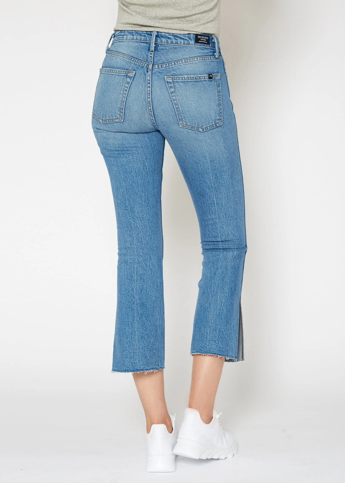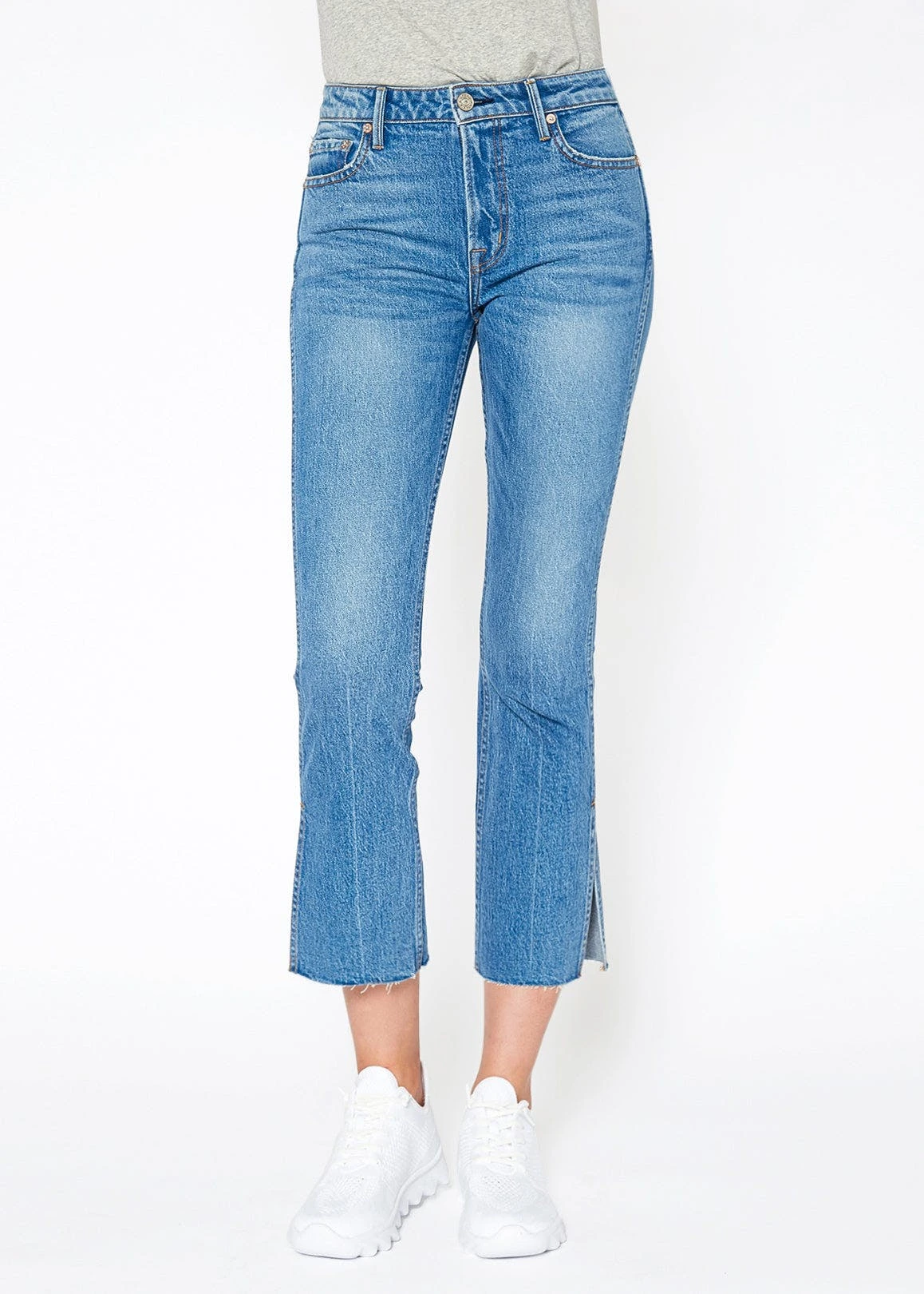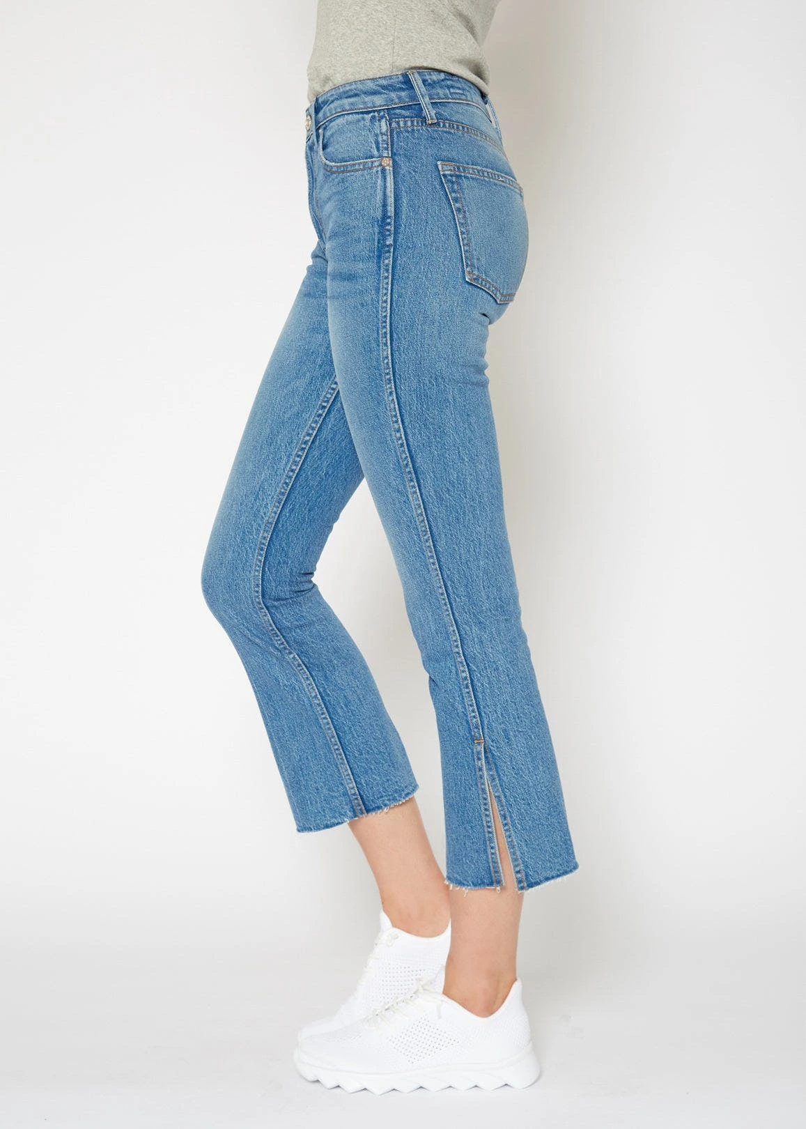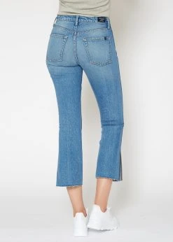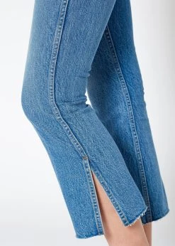High-rise kick flare crop with cut off hem & side slit wash: hudson contents: 99% cotton, 1% spandex rise: 10” inseam: 27” knee: 14 1/2” leg opening: 16” made in usaMay want to size up