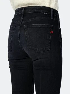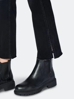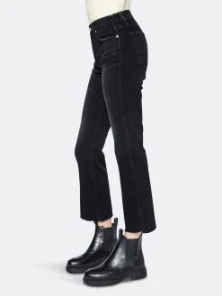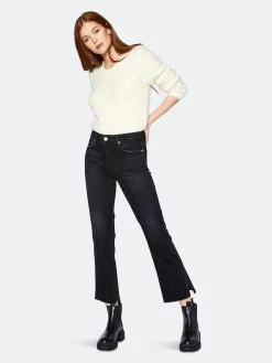 – Kick flare with cutoff hem and side slit- Rise 10″- Inseam 27″- Knee 14 1/2″- Leg Opening 16″- Made in USA
