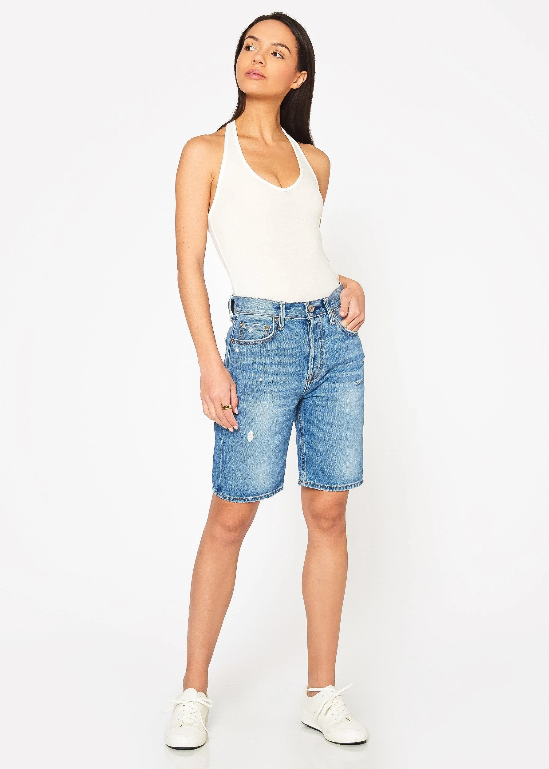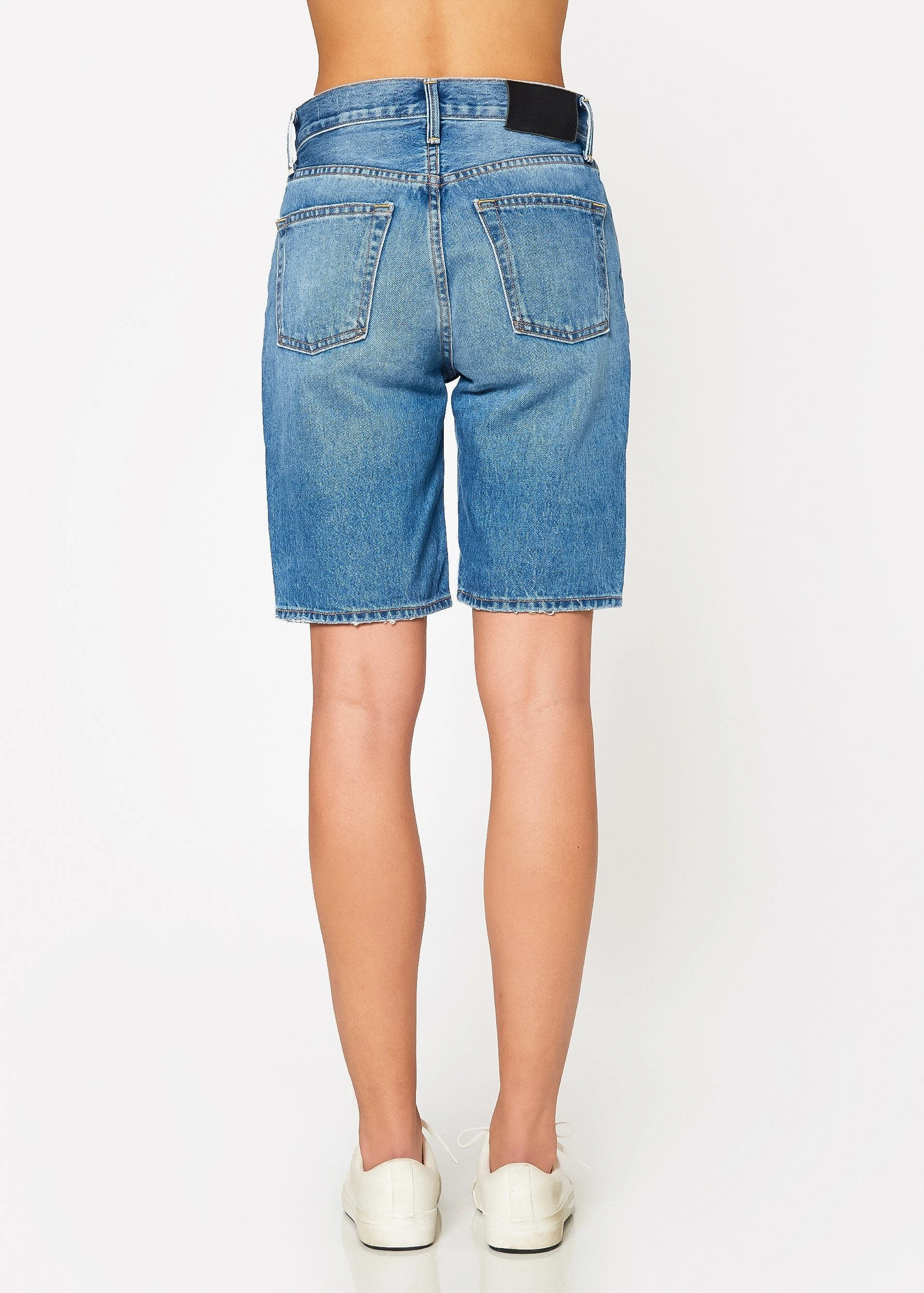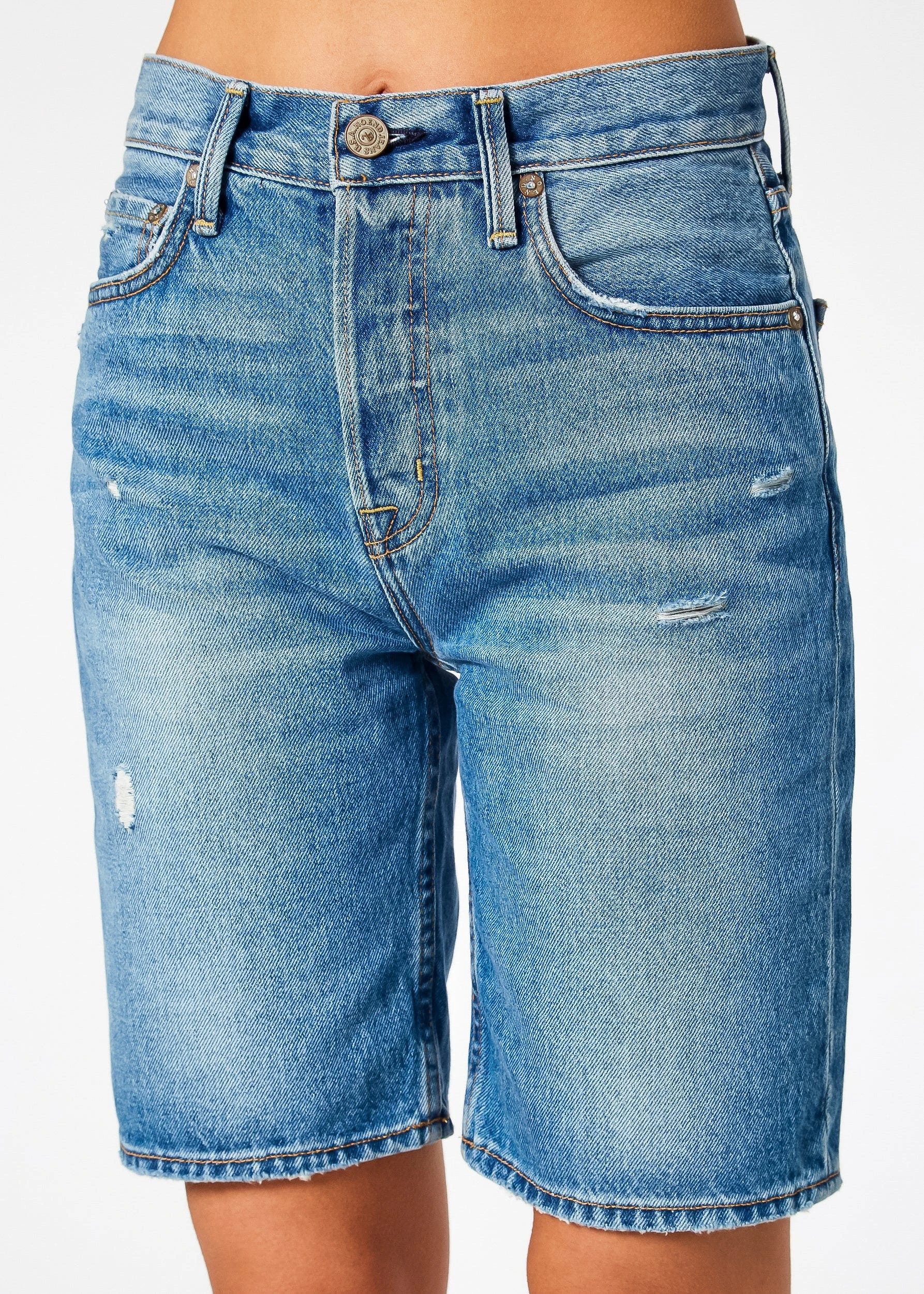 Naturally distressed 9″ hem shorts with a faded light blue wash. The Muse jean shorts feature a button fly and long inseam that hits mid-thigh.