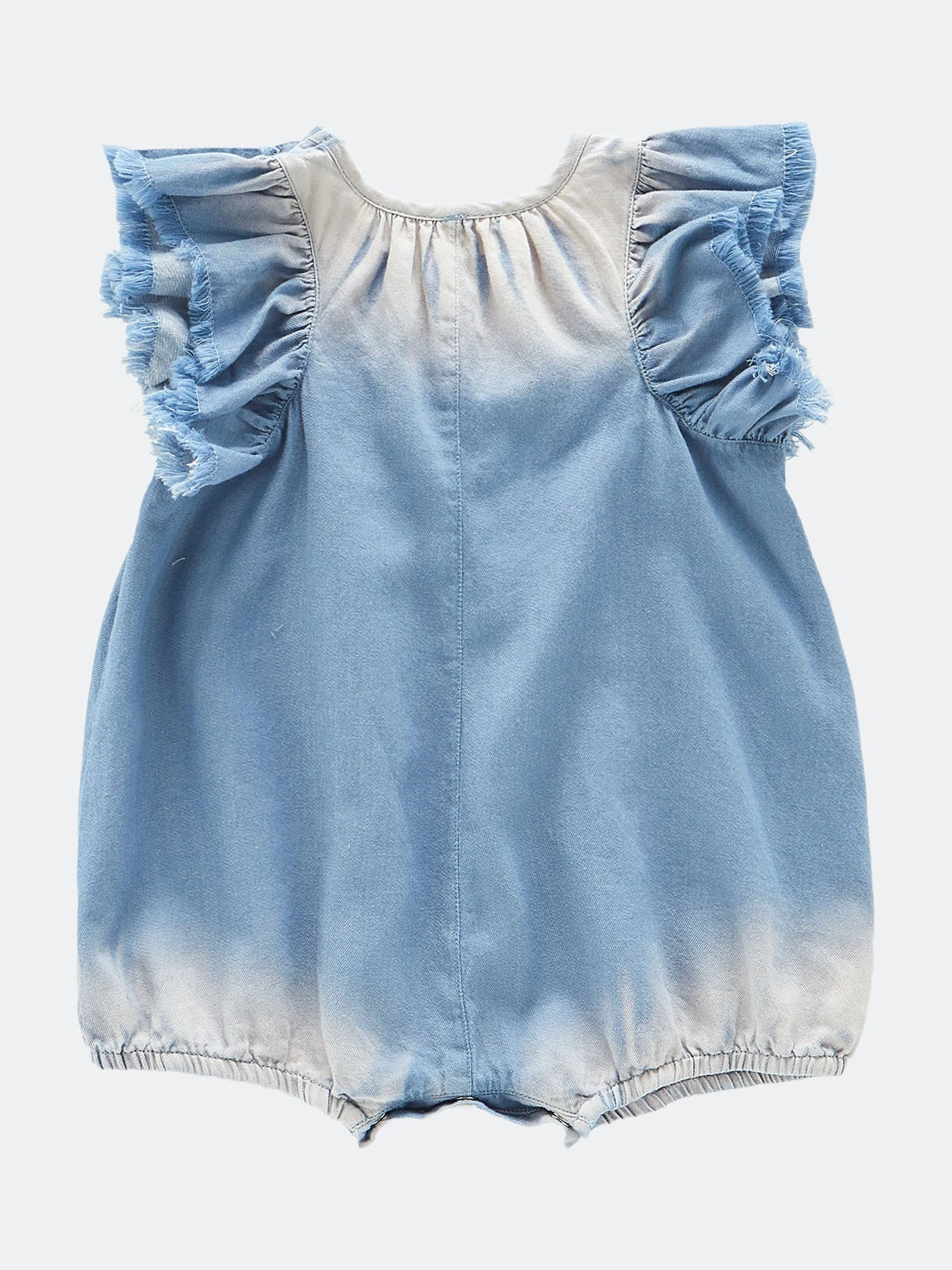 The coolest romper ever. It features bubble shape, fringed sleeve ruffles, dip-bleached finish and just perfect for the summer.