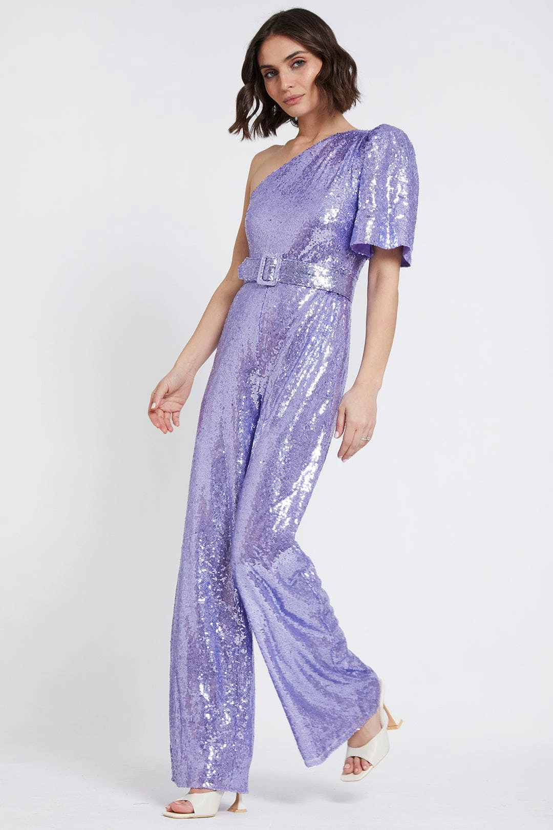 This sparkly Spring hues are finally in! This lavender stretch sequin jumpsuit is perfect for welcoming the warmer weather.The Fay is a one-shoulder jumpsuit with belt buckle detailing around the waist––extra groovy touch! This is a unique jumpsuit for wedding guests tired of wearing the same old little black dress. The Fay was made to dance the night away. One-shoulder lavender sequin jumpsuit with wide legs pants and a removeable belt.If you prefer a more fitted look or are unsure about your size, recommend sizing down. This jumpsuit has plenty of stretch.