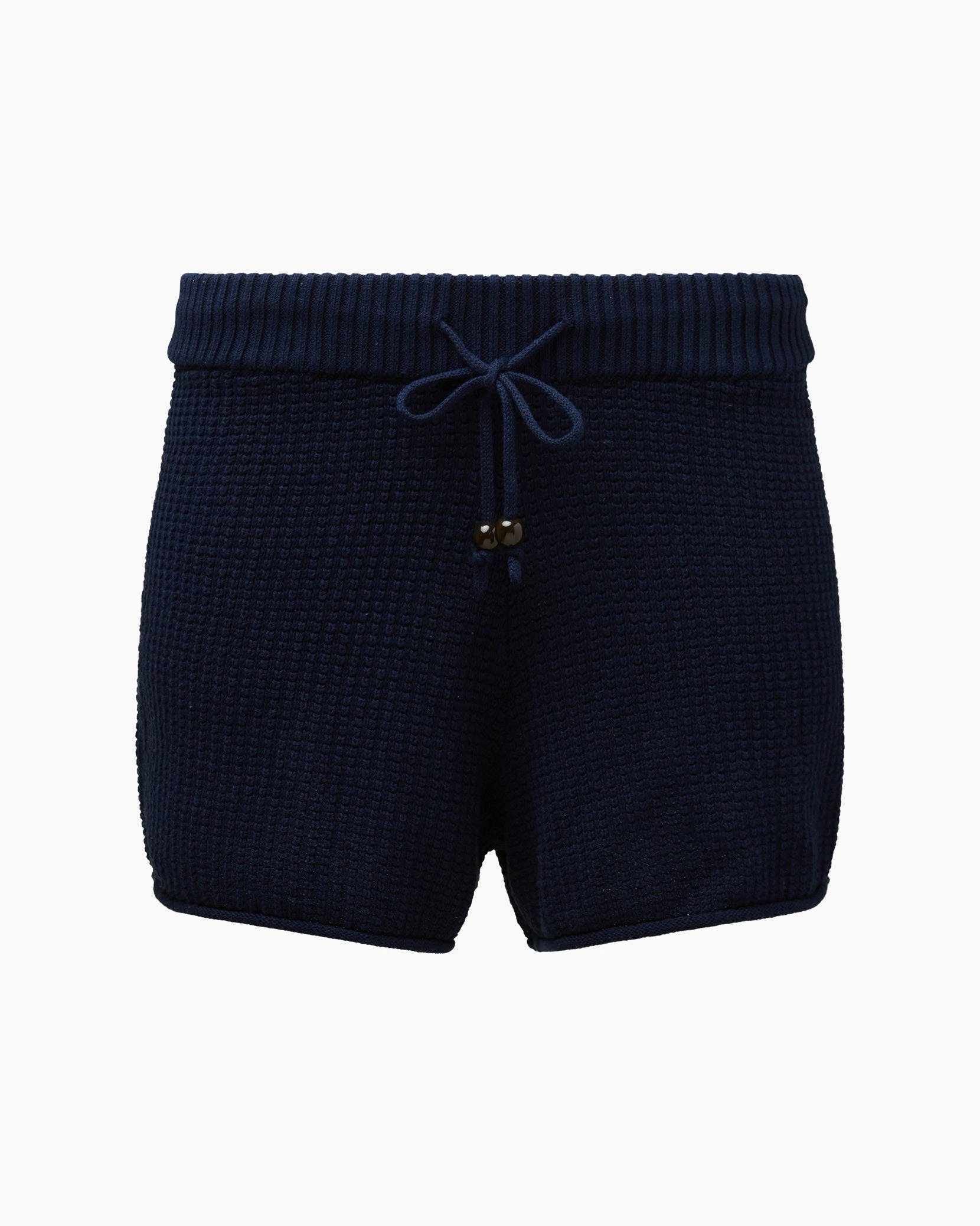 This high-waisted Pull On Short is made from breathable cotton in a waffled knit that feels soft against the skin. The pair is cut for a slightly loose fit with a rolled hem and bead-tipped ties at the ribbed waistband.The Cotton Waffle Sweater Pull On Short pairs well with the Cotton Waffle Sweater Cropped Crewneck.