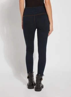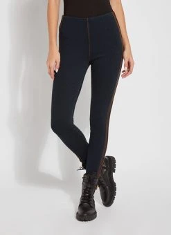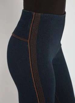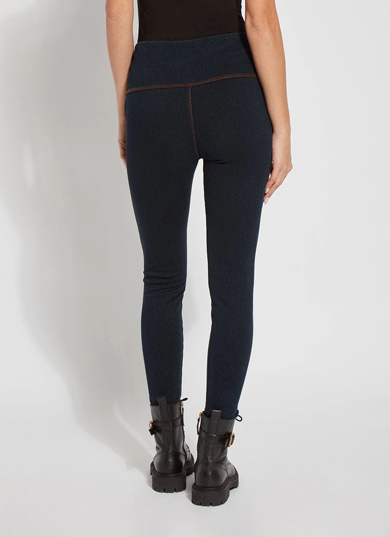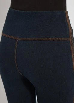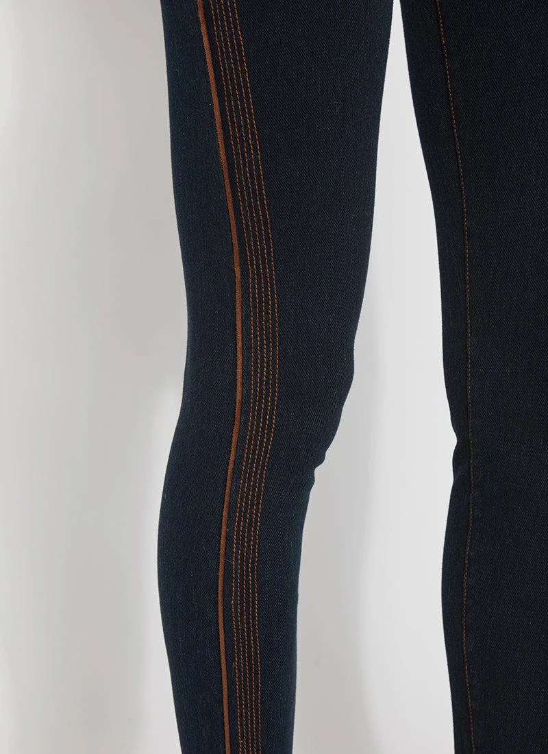 The Denim Reagan Legging w/Piping features a concealed patented waistband, back yoke, pull-on styling and side seams with bronze vegan suede piping and topstitching. These full-length leggings, constructed from 4-way stretch knit denim, offer a body-hugging, flattering fit. Showcase them with the token pullover top, in bronze, zora fringe suede jacket and booties.