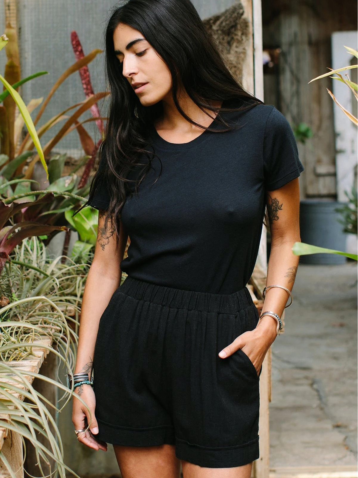 Crafted from our lightweight linen blend, the Sandy short is a warm weather essential. Featuring an elasticized waistband, slit pockets and a cuffed hem, these bottoms are comfortable and stylish. Pair with our hemp Delia tee or a matching linen top for an effortless daytime look.