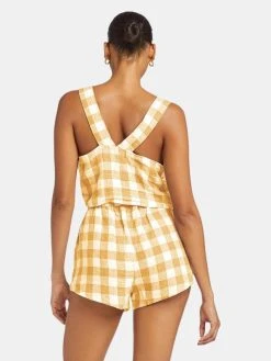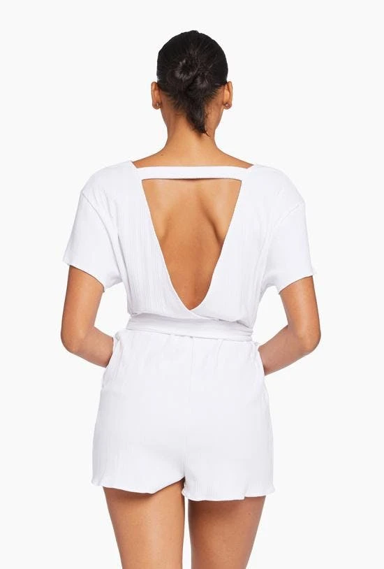 Goes on easy. A flowy romper with an adjustable tie at the waist.